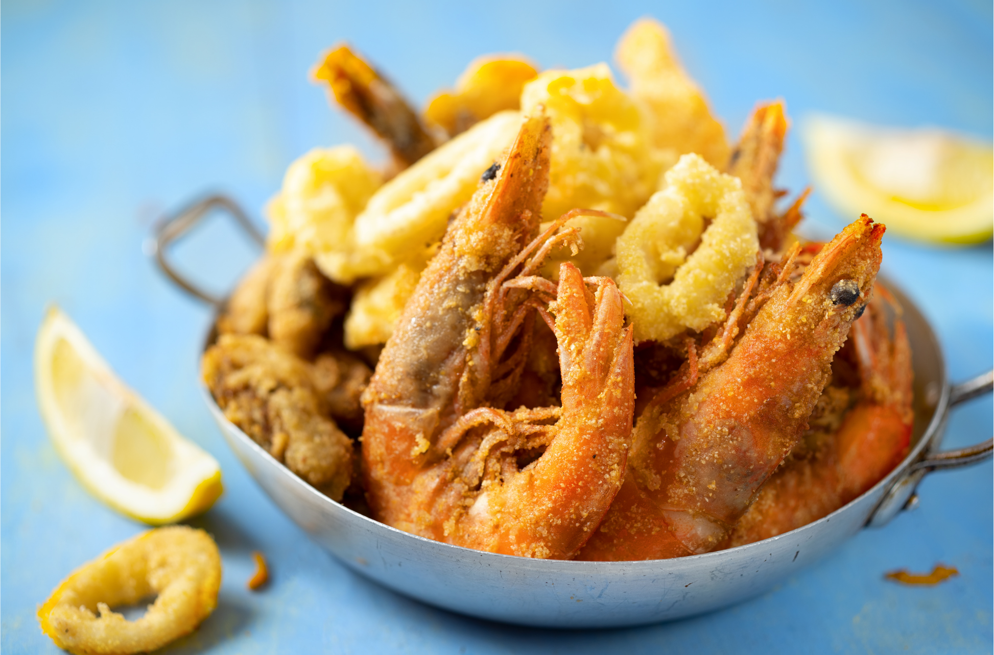 Serve the crispy assortment of fried seafood and vegetables hot, accompanied by lemon wedges for a zesty kick.