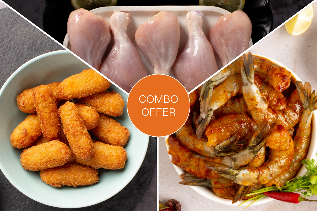 read more2 Fresh Large Prawns in Amritsari - Deveined & Cleaned Tail On (Net 250gm) + Crispy Fish Fingers (Net 250gm)+ Chicken Drumsticks (Net 400gm)A delightful mix of crunchy fish fingers, succulent Amritsari prawns, and juicy chicken drumsticks, offering a delicious variety of textures and flavors for a satisfying family feast.