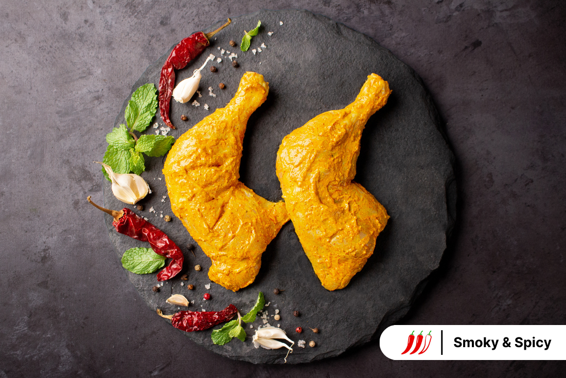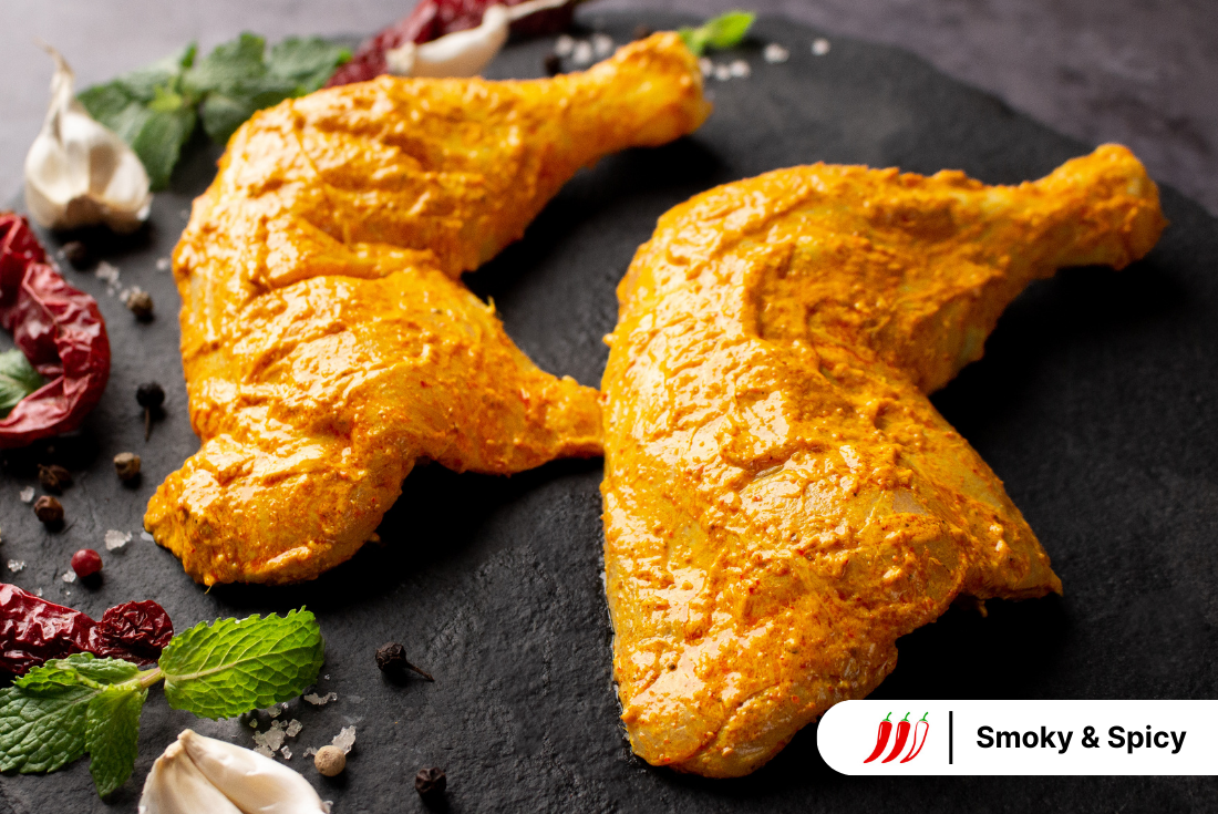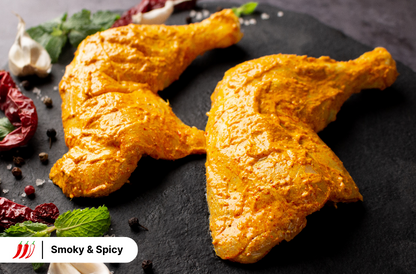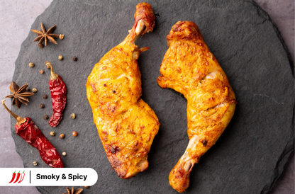 Introducing our Chicken Tandoori Whole Leg - a culinary masterpiece featuring tender chicken legs immersed in a spice-rich tandoori marinade. Experience the vibrant blend of cumin, coriander, paprika, turmeric, and yoghurt, creating a reddish-hued, smoky, and earthy flavour profile. For optimal taste, cook in an air fryer or oven; alternatively, use a pan or grill.