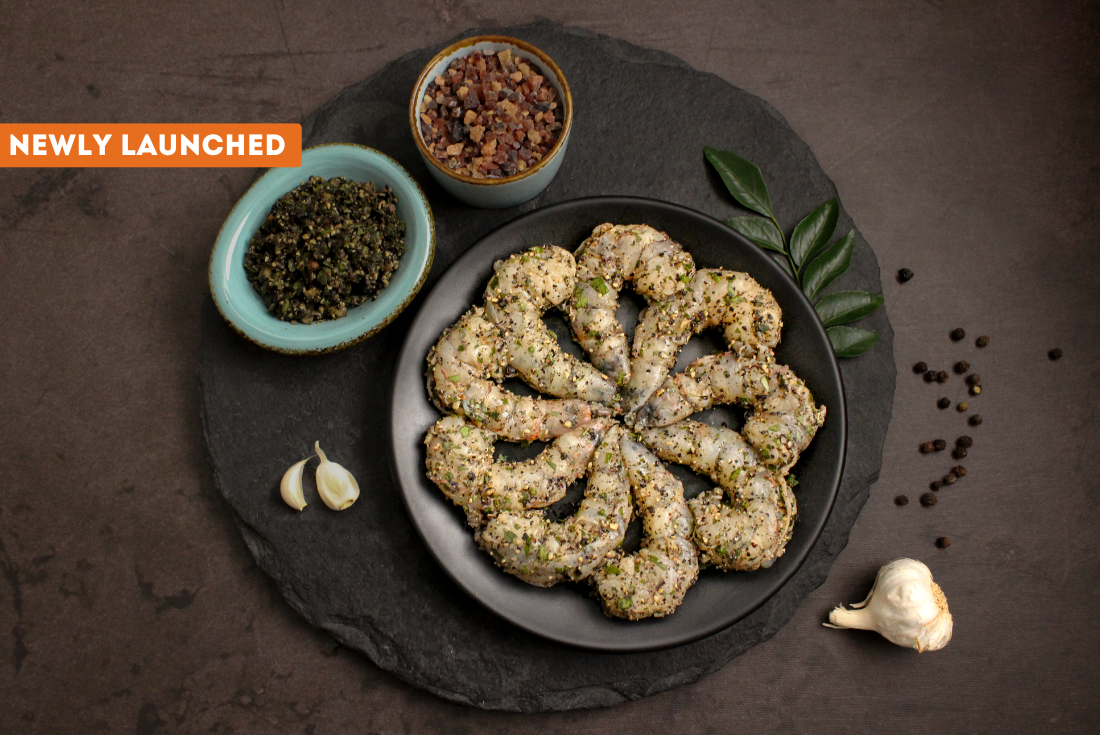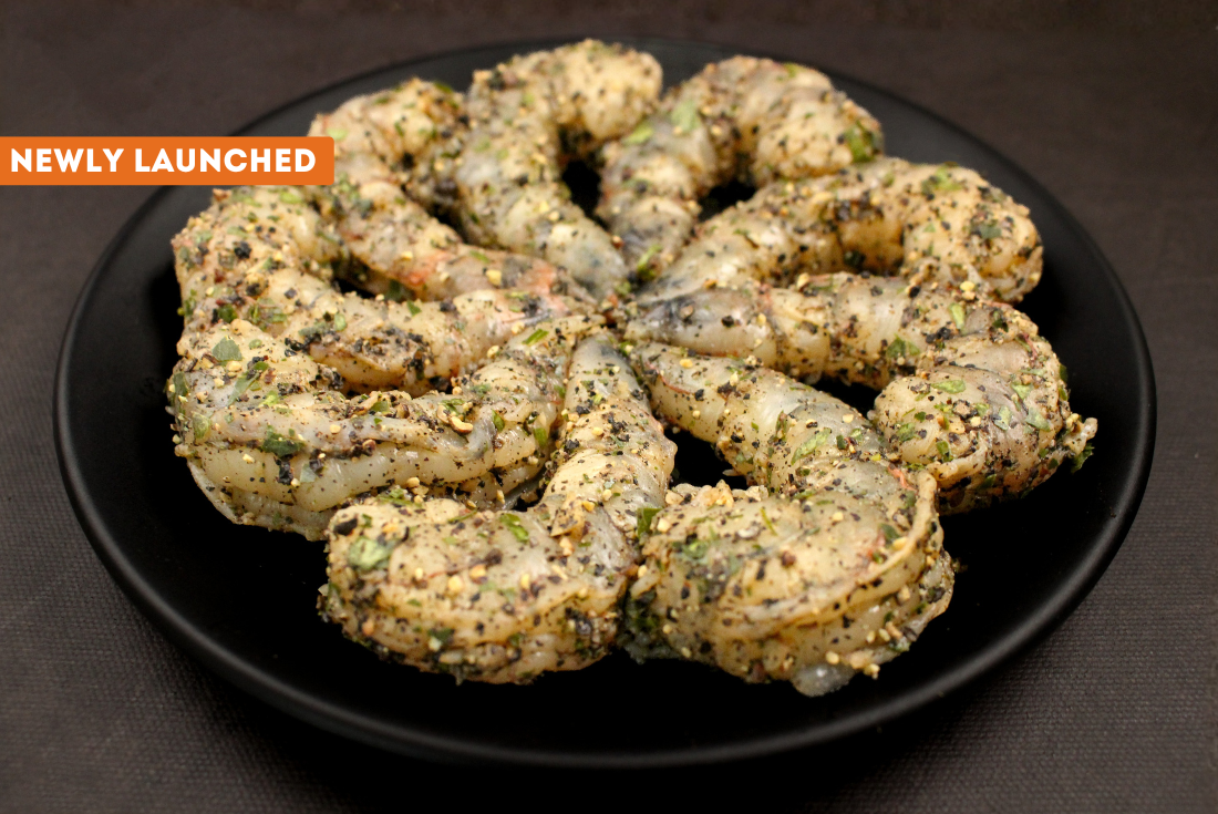 Fresh Large Prawns in garlic pepper (DVT) with plump prawns coated in a bold garlic and pepper rub. The heat stays subtle, the aroma irresistible, and the prawns remain juicy after cooking. A crowd-pleasing classic, ready in minutes.