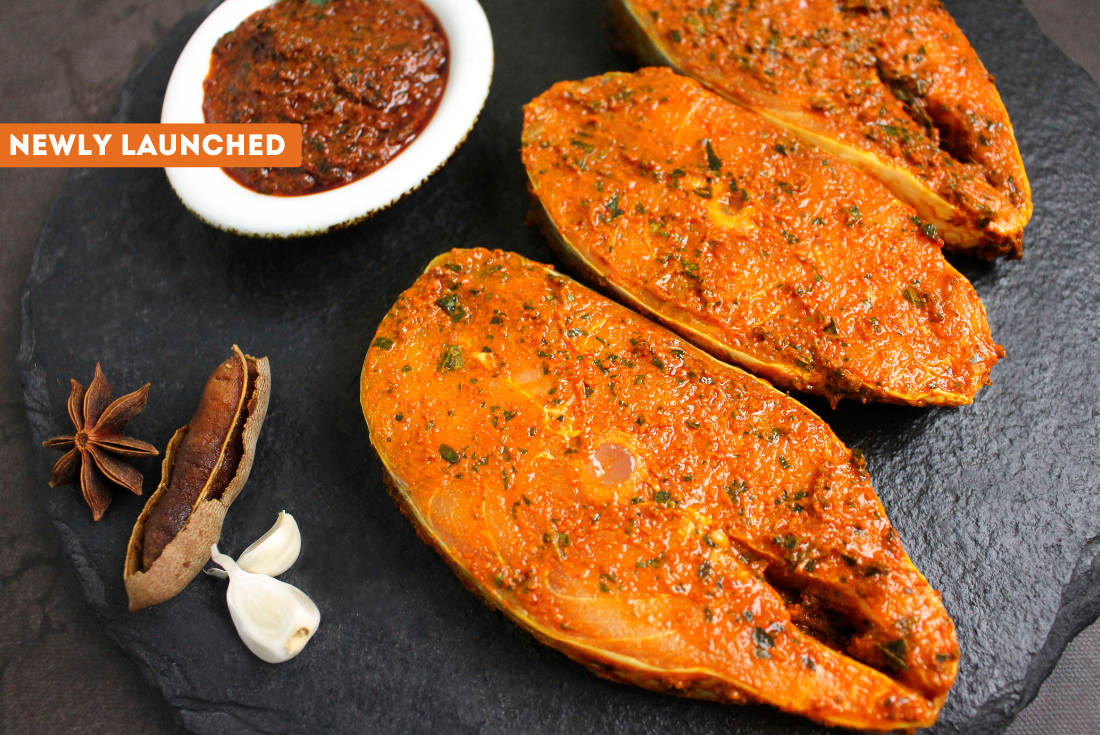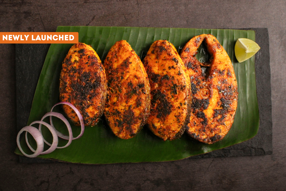 Fresh Rawas Steaks in konkan zing masala with a zesty, chilli-forward marinade that balances spice and sourness. Full of personality and packed with flavour, it cooks beautifully and is a great pick when you want something bold and satisfying.